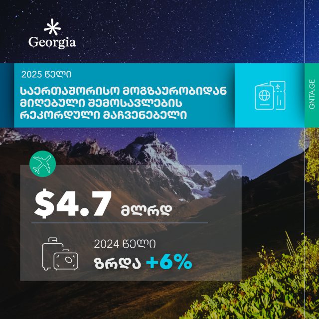 2025 წელი ტურიზმის ინდუსტრიისთვის რეკორდული იყო მიღებული შემოსავლების კუთხითაც – გასულ წელს მოგზაურობიდან (ტურიზმიდან) მიღებული შემოსავლები წლიურად 6.0%-ით გაიზარდა და 4,690.2 მილიონი აშშ. დოლარი შეადგინა. ასევე ზრდადი იყო შემოსავლები 2025 წლის მე-4 კვარტალში, სადაც ეს მაჩვენებელი 9.2%-ით გაიზარდა და 1,052.4 მილიონ აშშ. დოლარს გაუტოლდა.