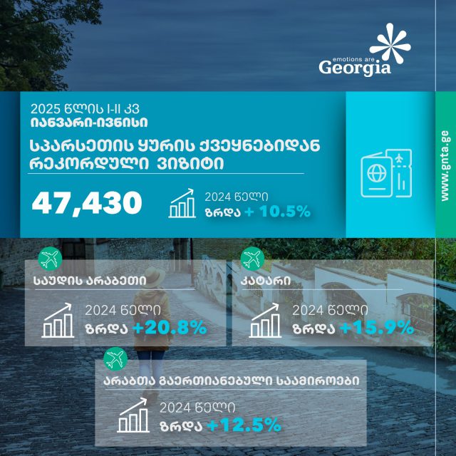 2025 წლის იანვარი-ივნისის პერიოდში, საქართველოში, სპარსეთის ყურის ქვეყნებიდან მოგზაურთა რეკორდული რაოდენობა დაფიქსირდა და 47,430 ვიზიტი შედგა, რაც +10.5%-ით, +4,525 ვიზიტით მეტია 2024 წლის ანალოგიურ პერიოდთან შედარებით.
