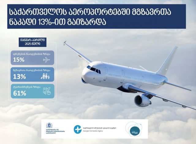 მიმდინარე წლის იანვარ-აპრილში, თბილისის საერთაშორისო აეროპორტი 1 442 458 მგზავრს მოემსახურა. ზრდამ 2024 წლის ანალოგიურ პერიოდთან მიმართებაში 13%-ი შეადგინა. პირველი ოთხი თვის მონაცემებით, ქუთაისის საერთაშორისო აეროპორტი 506 564 მგზავრს მოემსახურა, რაც 2%-ით მეტია გასული წლის ანალოგიურ პერიოდში გადაყვანილი მგზავრების რაოდენობაზე. ბათუმის საერთაშორისო აეროპორტის მეშვეობით გადაყვანილ იქნა 233 725 მგზავრი, რაც 44%-ით აღემატება 2024 წლის იანვარ-აპრილის მაჩვენებლებს.
