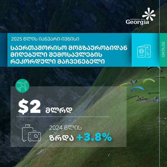 2025 წლის იანვარ-ივნისში საერთაშორისო მოგზაურობიდან მიღებული შემოსავლები წლიურად 3.8%-ით გაიზარდა და რეკორდულ მოცულობას – თითქმის 2 მილიარდ აშშ. დოლარს (1,971.0 მლნ აშშ დოლარს) გაუტოლდა.