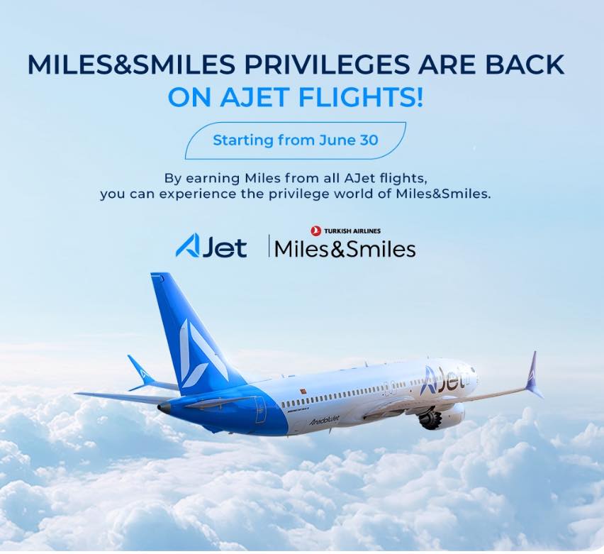 AJet-ი და Turkish Airlines-ის Miles&Smiles ლოიალურობის პროგრამა პარტნიორობას იწყებენ, რაც მგზავრებს საშუალებას აძლევს, დააგროვონ Miles-ები AJet-ის როგორც შიდა, ისე საერთაშორისო რეისებზე. დაგროვილი მილები პირდაპირ თქვენს Miles&Smiles ანგარიშზე ჩაირიცხება.