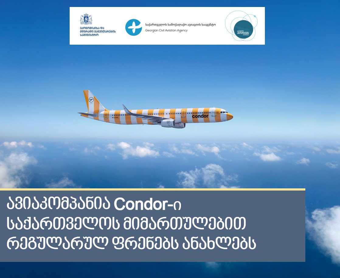 გერმანული ავიაკომპანია Condor-ი საქართველოს საავიაციო ბაზარზე ბრუნდება. მიმდინარე წლის 15 ივნისიდან, ავიაკომპანია სამგზავრო ფრენებს ფრანკფურტი – თბილისი – ფრანკფურტის საჰაერო ხაზზე შეასრულებს. სამოქალაქო ავიაციის სააგენტოში წარმოდგენილი განაცხადის შესაბამისად, რეგულარული საჰაერო მიმოსვლა ყოველდღიურად, Embraer 190 ტიპის საჰაერო ხომალდებით განხორციელდება.