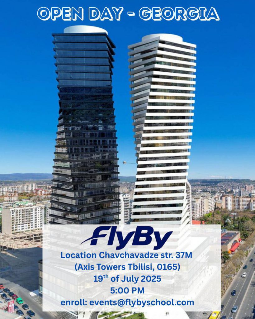 ესპანური აკადემია FlyBy Aviation Academy, რომელიც ევროპაში პილოტთა მომზადებაში ლიდერობს, საქართველოში ღია კარის დღის ჩასატარებლად ემზადება. შეხვედრა 19 ივლისს, თბილისის დროით 17:00 საათზე, Axis Towers-ში გაიმართება.