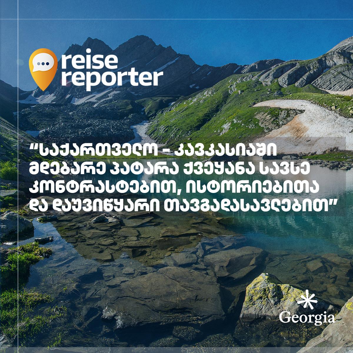 ცნობილი გერმანულ სამოგზაურო პლატფორმა Reisereporter საქართველოს ტურისტული პონტენციალის შესახებ სტატიას აქვეყნებს სათაურით „ყველაზე შთამბეჭდავი ადგილები საქართველოში მოგზაურობისთვის“.