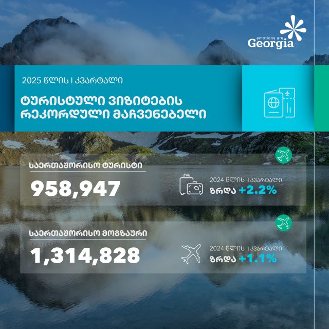 საქართველოში 2025 წლის იანვარი-მარტის პერიოდში, საერთაშორისო ტურისტული ვიზიტების რეკორდული მაჩვენებელი დაფიქსირდა და ისტორიული მაქსიმუმი 958,947 ვიზიტი შეადგინა, ზრდა 2024 წლის ანალოგიურ პერიოდთან შედარებით +2.2%-ია. აღნიშნულის შესახებ ინფორმაციას ტურიზმის ეროვნული ადმინისტრაცია ავრცელებს.