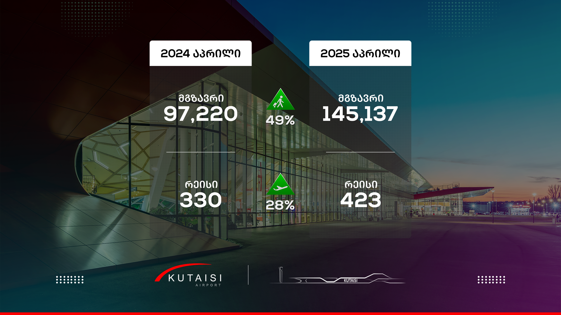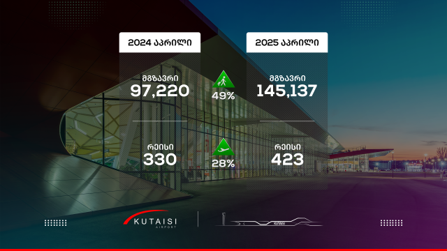 რაც შეეხება 4 თვის ჯამურ მონაცემს, ქუთაისის დავით აღმაშენებლის სახელობის საერთაშორისო აეროპორტი 2025 წლის იანვარ-აპრილში 506,564 მგზავრსა და 1,533 რეისს მოემსახურა. წინა წელთან შედარებით მგზავრთნაკადის 2,3%-იანი ზრდა ფიქსირდება (2024 წლის 4 თვე – 495,235 მგზავრი), ხოლო რეისების რაოდენობა უცვლელია.