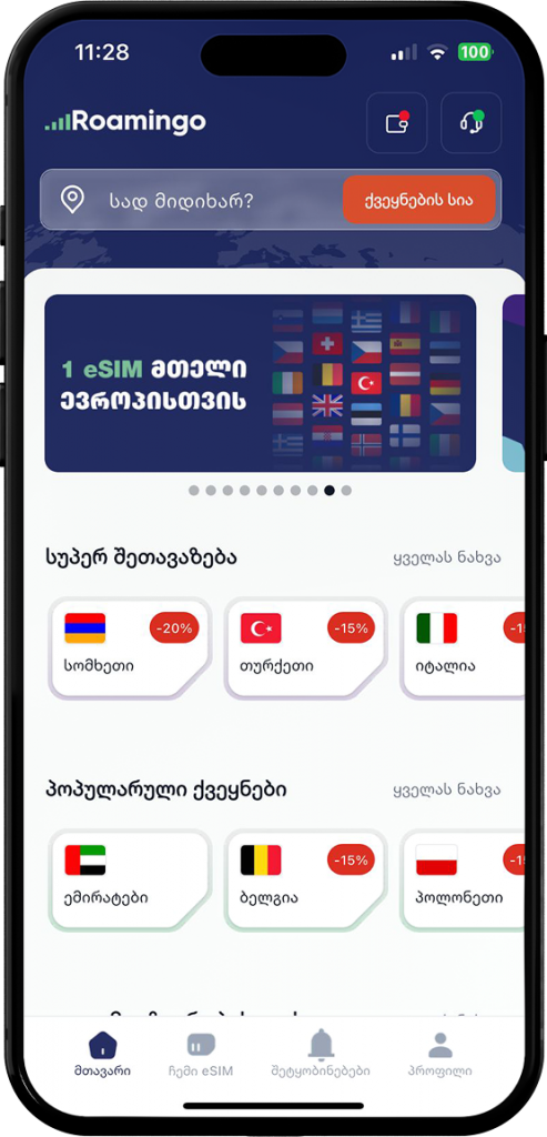 სპეციალური შეთავაზება PLUS ბარათის მფლობელებს! თუ საქართველოს ბანკის PLUS ბარათს იყენებ, Roamingo-ს აპლიკაციაში ნებისმიერ სამოგზაურო ინტერნეტის შეძენისას, გადახდილი თანხის 15%-ს დაიბრუნებ ბარათზე.