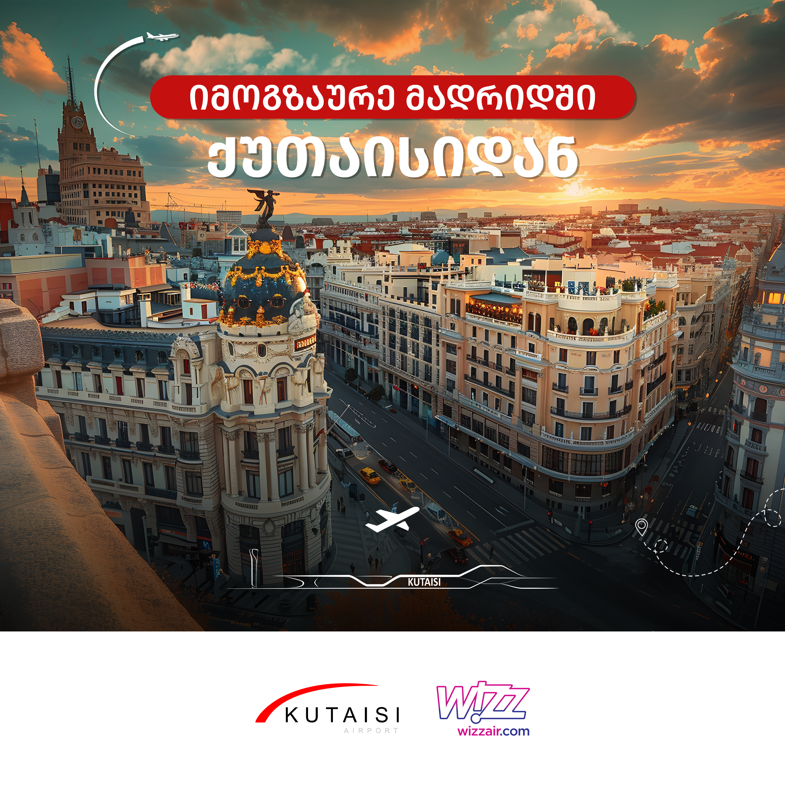 დღეიდან, კვირაში ორი სიხშირით, ქუთაისის დავით აღმაშენებლის სახელობის საერთაშორისო აეროპორტიდან ავიაკომპანია Wizz Air-მა ესპანეთის დედაქალაქ მადრიდის მიმართულებით პირდაპირი რეგულარული რეისები განაახლა. ესპანეთის დედაქალაქისკენ ქუთაისის საერთაშორისო აეროპორტიდან 230 მგზავრით სავსე ხომალდი ცოტა ხნის წინ გაფრინდა.