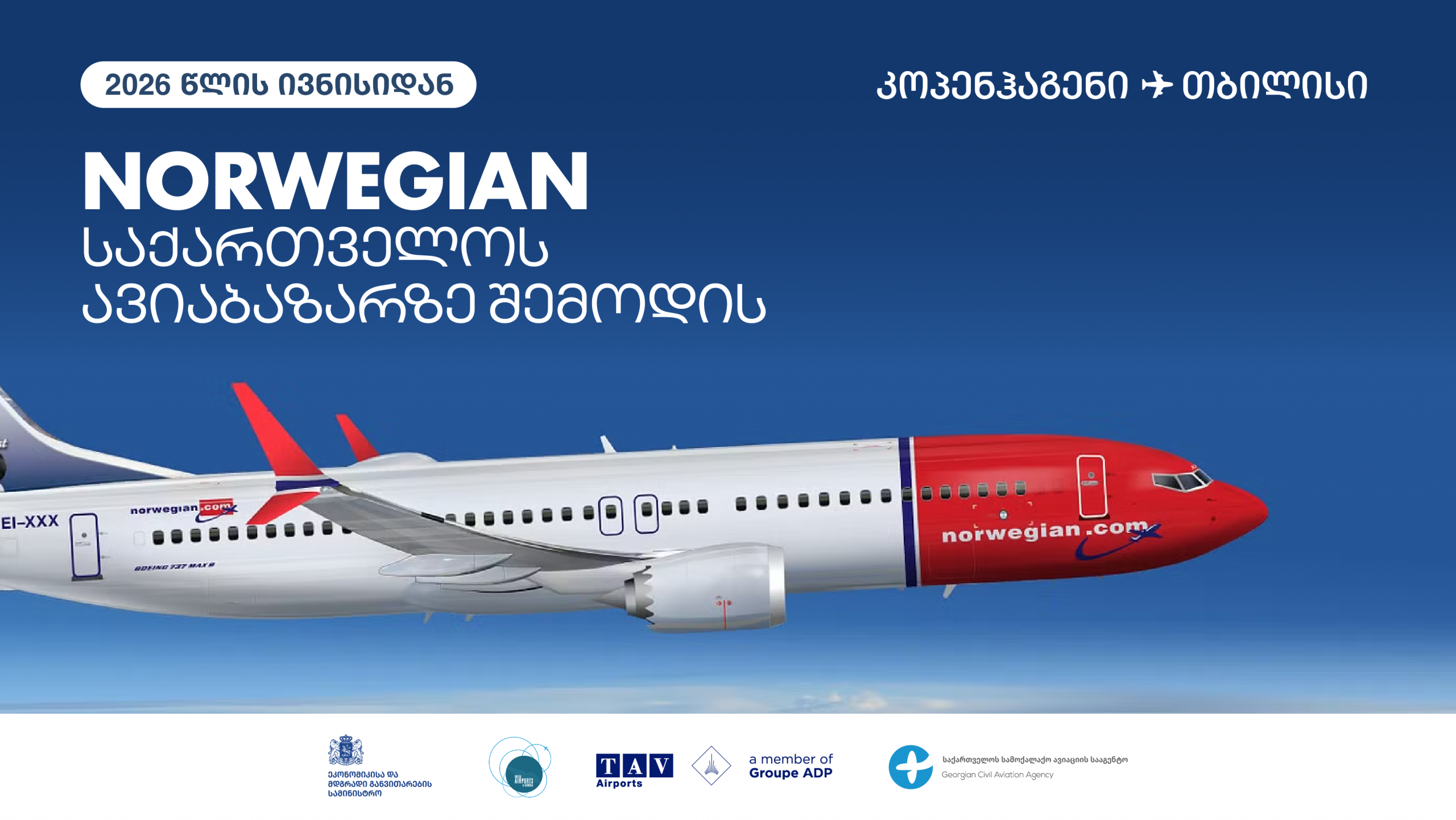 საქართველოს ავიაბაზარზე კიდევ ერთი დაბალბიუჯეტიანი ევროპული ავიაკომპანია, ნორვეჯიანი – Norwegian შემოდის. ნორვეგიის ყველაზე დიდი და სკანდინავიის სიდიდით მეორე ავიაკომპანია კოპენჰაგენი-თბილისი-კოპენჰაგენის მიმართულებით 2026 წლის ზაფხულიდან იფრენს.ისტორიაში პირველად, პირდაპირი რეგულარული რეისები დანიის სამეფოსა და საქართველოს დედაქალაქებს შორის 2026 წლის 27 ივნისიდან კვირაში ორი სიხშირით შესრულდება.