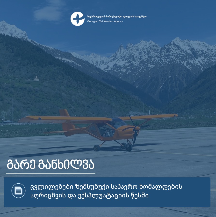 ცვლილების პროექტი გარე განხილვის ფარგლებში გამოქვეყნდა სააგენტოს ვებ-გვერდზე და ხელმისაწვდომია შემდეგ ბმულზე: https://gcaa.ge/draft-regulations/