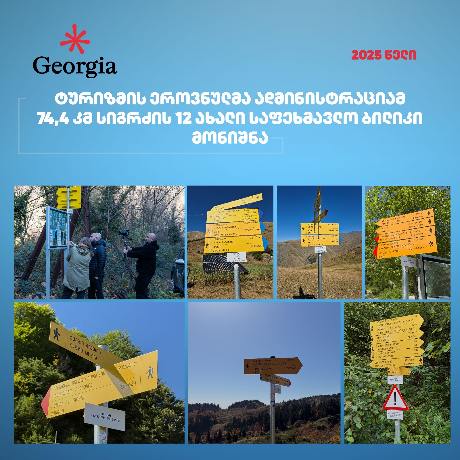 ტურიზმის ეროვნული ადმინისტრაცია მთელი ქვეყნის მასშტაბით საფეხმავლო ბილიკების მარკირებას აგრძელებს. ადმინისტრაციის ორგანიზებით, წელს, 74,4 კმ სიგრძის 12 ბილიკი მოინიშნა: რაჭა-ლეჩხუმ ქვემო სვანეთის, ქვემო ქართლის, იმერეთის, მცხეთა-მთიანეთის რეგიონებსა და თბილისის შემოგარენში.